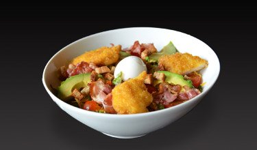 Salade mélangée, avocat, œuf mollet français, véritable cheddar de Grande-Bretagne, filets de poulet français croustillants, dés de tomate, lard fumé français et croûtons de focaccia.