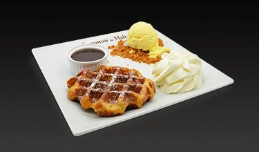 Accompagnée d'une boule de glace vanille, crème fouettée et sauce au choix (chocolat, caramel au beurre salé ou spéculoos).