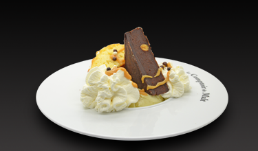 Une boule de glace chocolat noir, une boule de glace caramel au beurre salé, une boule de glace vanille, nappées d'une sauce caramel au beurre salé, accompagnées d'une madeleine, perles craquantes au chocolat et crème fouettée.