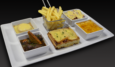 Médaillon de filet mignon de porc français gratiné au fromage à raclette, croziflette au reblochon au lait cru AOP et à la saucisse Diot fumée française, gaufre garnie de confit de bacon et gratinée au maroilles artisanal au lait cru AOP et deux spécialités à la bière : welsh et carbonade de boeuf. En portion découverte. Servie avec frites.