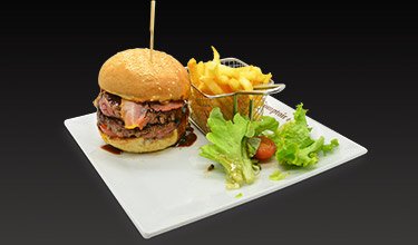 Steak haché frais français, lard fumé français, véritable cheddar de Grande-Bretagne, oignons confits, salade, rondelles de tomate fraîche, cornichons aigres-doux et sauce barbecue.