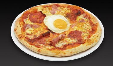 Base tomate, jambon blanc français, spianata légèrement piquante, véritable cheddar de Grande-Bretagne, mozzarella fior di latte, œuf sur le plat français et origan.
