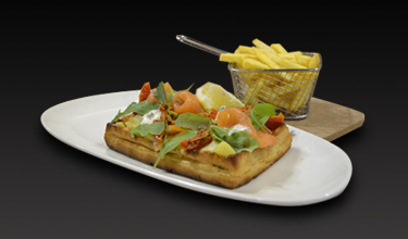 Gaufre bruxelloise garnie de dés de pommes de terre, sauce tartare, mozzarella fior di latte, tomates séchées, saumon fumé Mowi et salade roquette. Servie avec frites.
